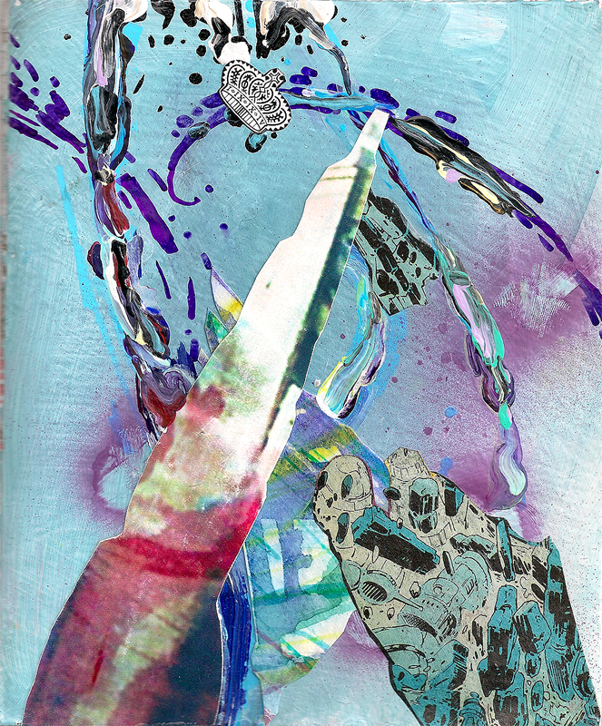 Blue Pink Boil - 2022. Collage, spray paint, marker on cardboard, 6.5 x 8.25 inches