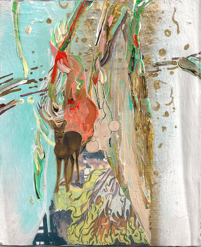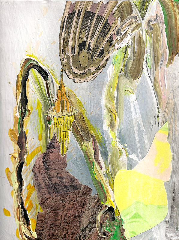 Gold Raucous - 2022. Collage, spray paint, marker on cardboard, 6.25 x 8.25 inches